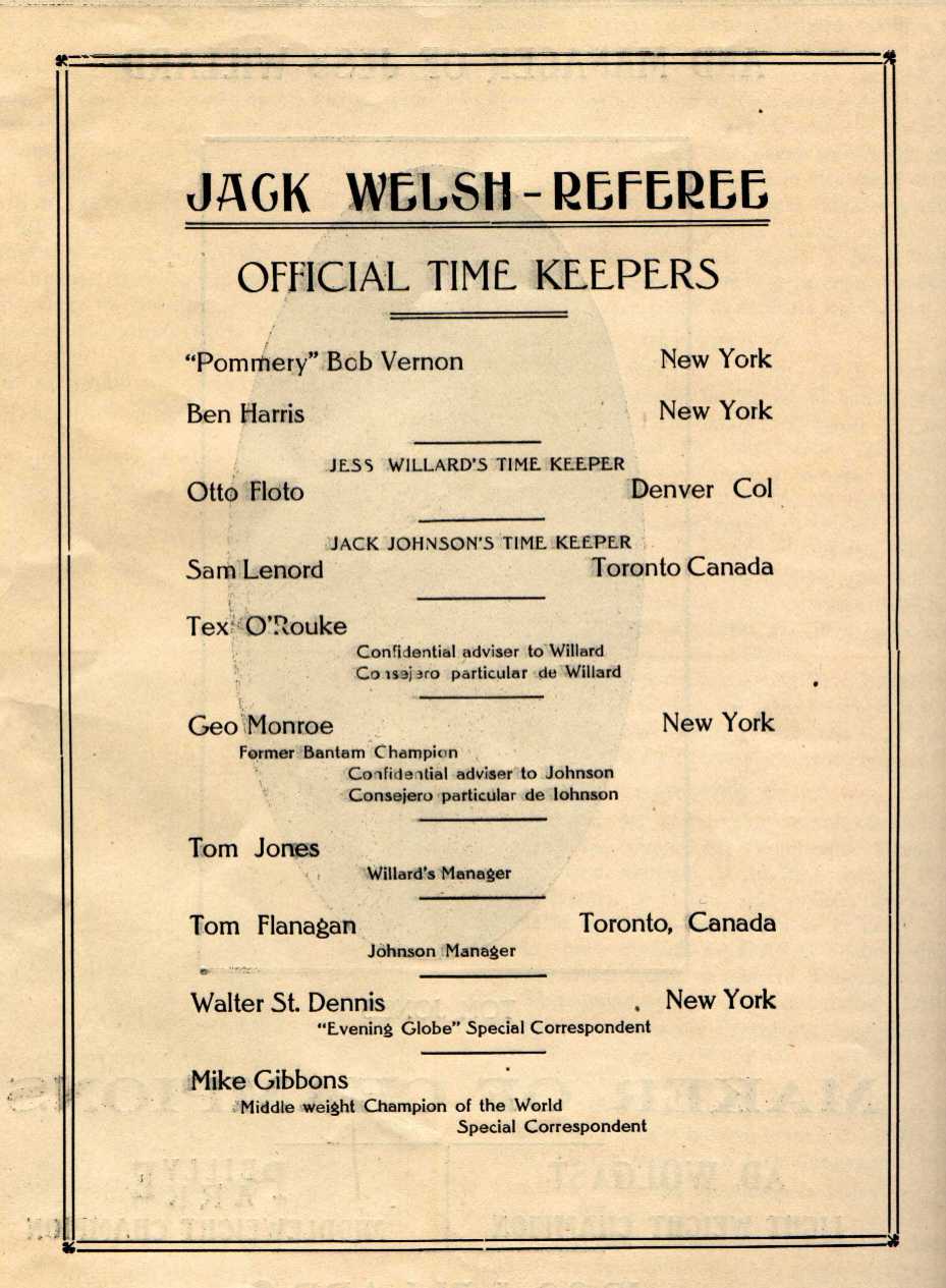 Jack Johnson - Jess Willard Souvenir Magazine - Official Time Keepers Page